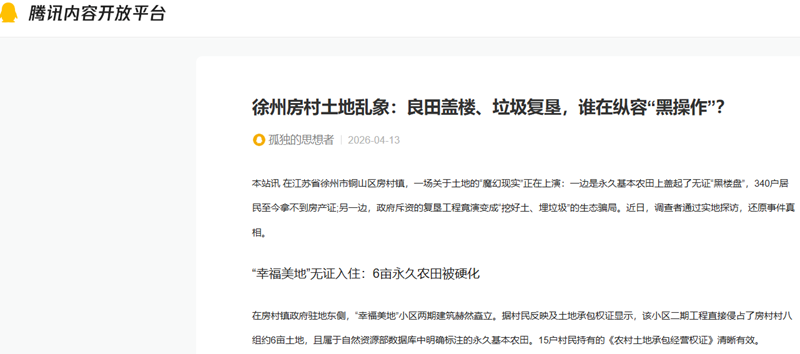 本站讯 在江苏省徐州市铜山区房村镇,一场关于土地的“魔幻现实”正在上演:一边是永久基本农田上盖起了无证“黑楼盘”,340户居民至今拿不到房产证;另一边,政府斥资的复垦工程竟演变成“挖好土、埋垃圾”的生态骗局。近日,调查者通过实地探访,还原事件真相。